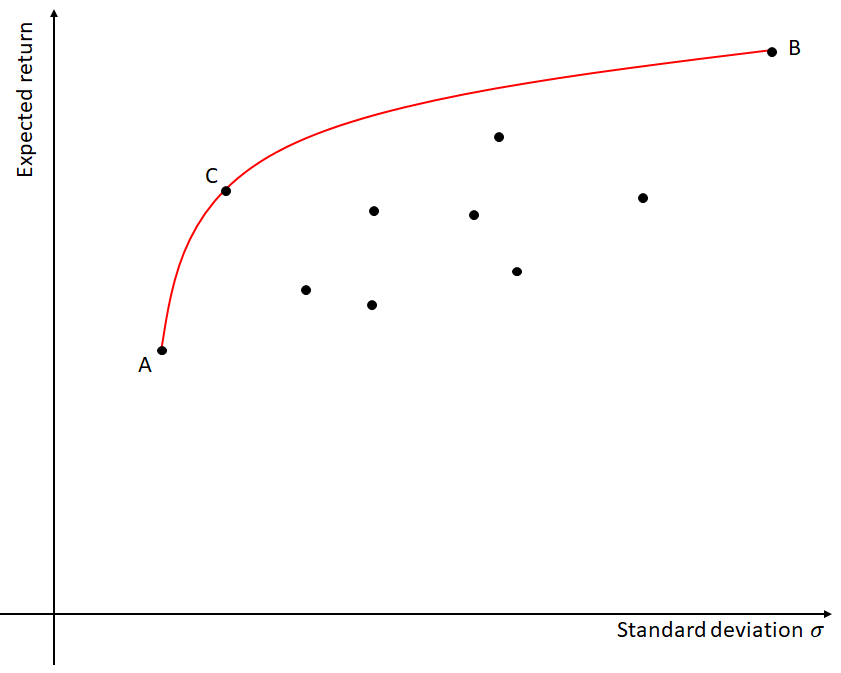 We considered a simplistic example, in reality you can create your portfolio with more than two stocks. Consider an example in which you are investing in a portfolio of 10 stocks like in the picture like in the picture below. In this case you expand your possibilities and you can obtain more risk-return combinations than before. The red line in the picture represents the so called efficient portfolios. An efficient portfolio is a portfolio that offers the highest possible return given the level of risk you are willing to bear. In order to find the set of efficient portfolios, you need to use a quadratic computer, the standard deviation and the expected return of each stock.